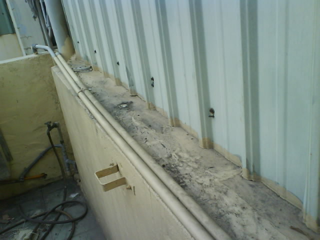 外墻│墻壁防水抓漏工程 ~~上圖中這么多管路的下方是漏水處,它的漏水源大致應(yīng)該是在這里沒有錯(cuò), 水是從哪里滲漏說真的沒有一個(gè)人可以確實(shí)地告訴你, 在施工上我們要以全面性防水施作的心態(tài), 可以防止水無孔不入的特性.
