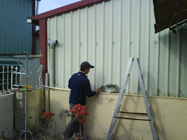 外墻│墻壁防水工程 ~~有全面性防水的心態(tài)才不會造成抓這裡漏那里的情況. 將可能造成漏水的必須施工處整理清潔, 此工程是采用外墻瓷磚面專用的透明防水材, 施作全面性包覆, 鐵皮屋烤漆浪板搭接處,還有釘頭補(bǔ)上填縫材(速利康).