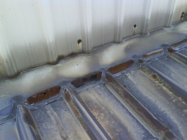 高雄抓漏-鐵皮屋漏水修繕 因凸出的部位擋住泄水溝,造成一下雨就會積水無法流出,時間久了導(dǎo)致鐵皮屋銹蝕,而造成漏水.原因?yàn)?鐵工施工不慎.首先應(yīng)觀察別處是否還有漏水的可能性,將漏水施工處做全面性處理,以防止水的無孔不入的特性