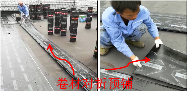 在處理好的基面上,先將瀝青類卷材按鋪貼順序(注意:長邊搭接8cm,短邊搭接10cm)進行大面積預(yù)鋪,然后將每卷卷材對折翻揭覆鋪(如圖)。